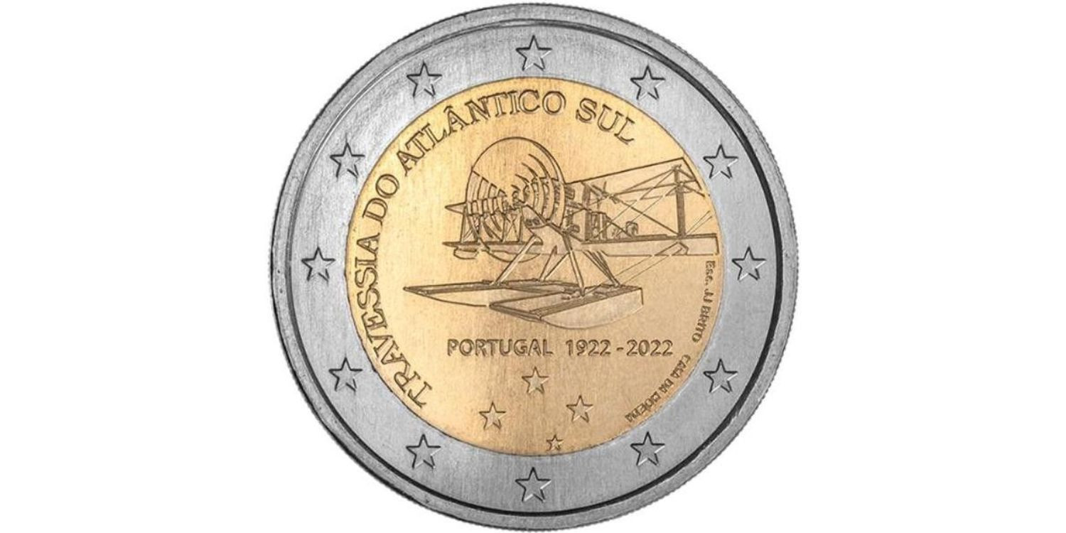 2 euros Conmemorativos de Portugal del Centenario de la Primera travesía aérea del Atlántico sur, realizada por los aviadores portugueses Carlos Viegas Gago Coutinho y Artur de Sacadura Freire Cabral entre el 30 de marzo y el 17 de junio de 1922