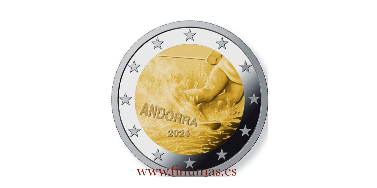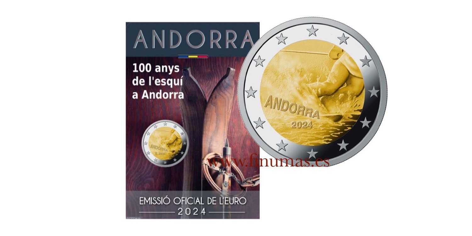 Moneda De 2€ Conmemorativa de los 100 Años de Esquí en Andorra. Acuñada por el Govern de Andorra, muestra la imagen de las piernas de un esquiador en pleno descenso