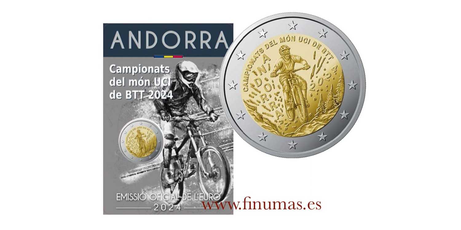 Moneda De 2€ Conmemorativa del Campeonato del Mundo UCI de BTT celebrado en Andorra del 26 de Agosto al 1 de Septiembre. La moneda muestra un piloto en su bicicleta en pleno descenso