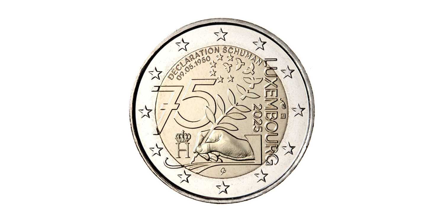 2€ Conmemorativos Luxemburgo 2025 dedicada al 75º Aniversario de la Declaración Schuman, la cual simboliza la reconciliación y la cooperación entre las naciones europeas tras la Segunda Guerra Mundial