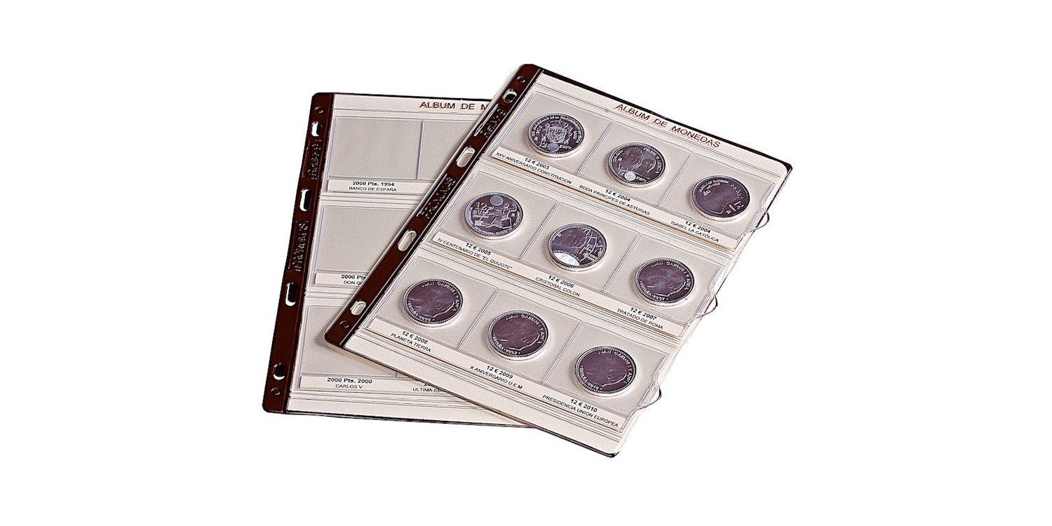 Juego de 2 hojas diseñado para coleccionar y conservar en perfectas condiciones la colección de 18 monedas de 2000 pesetas y 12 € acuñadas entre los años 2004 y 2010.