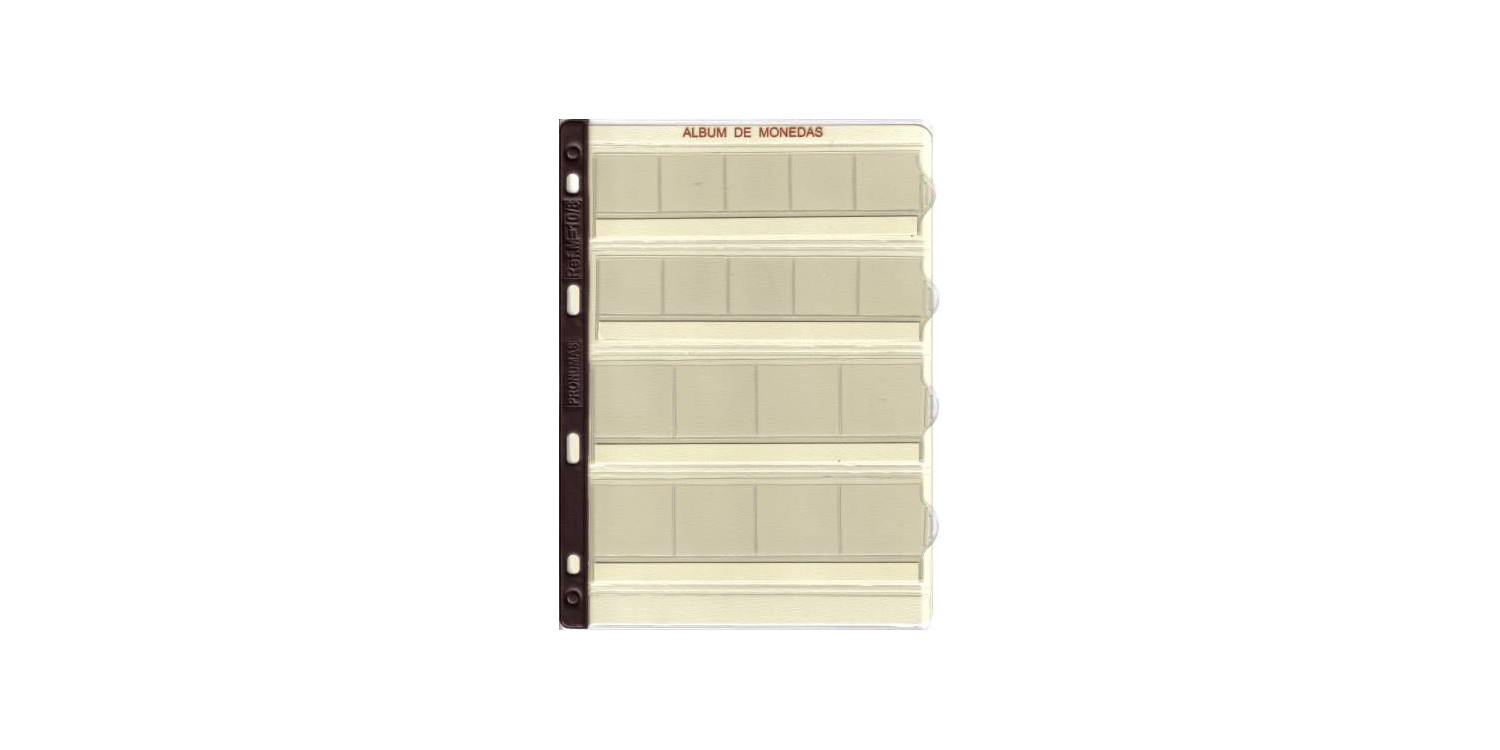 Hoja para coleccionar monedas fabricada en plastico de primera calidad. Lomo reforzado. Su sistema de alojamiento permite una optima conservacion de las monedas. Una tira de cartulina en cada seccion permite añadir anotaciones en la base de cada pieza. 10 departamentos de 28x28mm. y 8 departamentos de 35x35mm. Incluye cartulina separadora