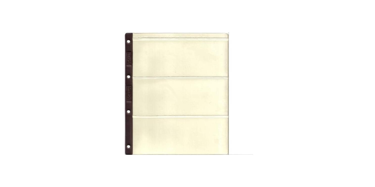 Hoja de 3 espacios fabricada en plastico de maxima calidad ideal para billetes medianos de hasta 19 x 7,5cm. Lomo reforzado. Incluye cartulina separadora.