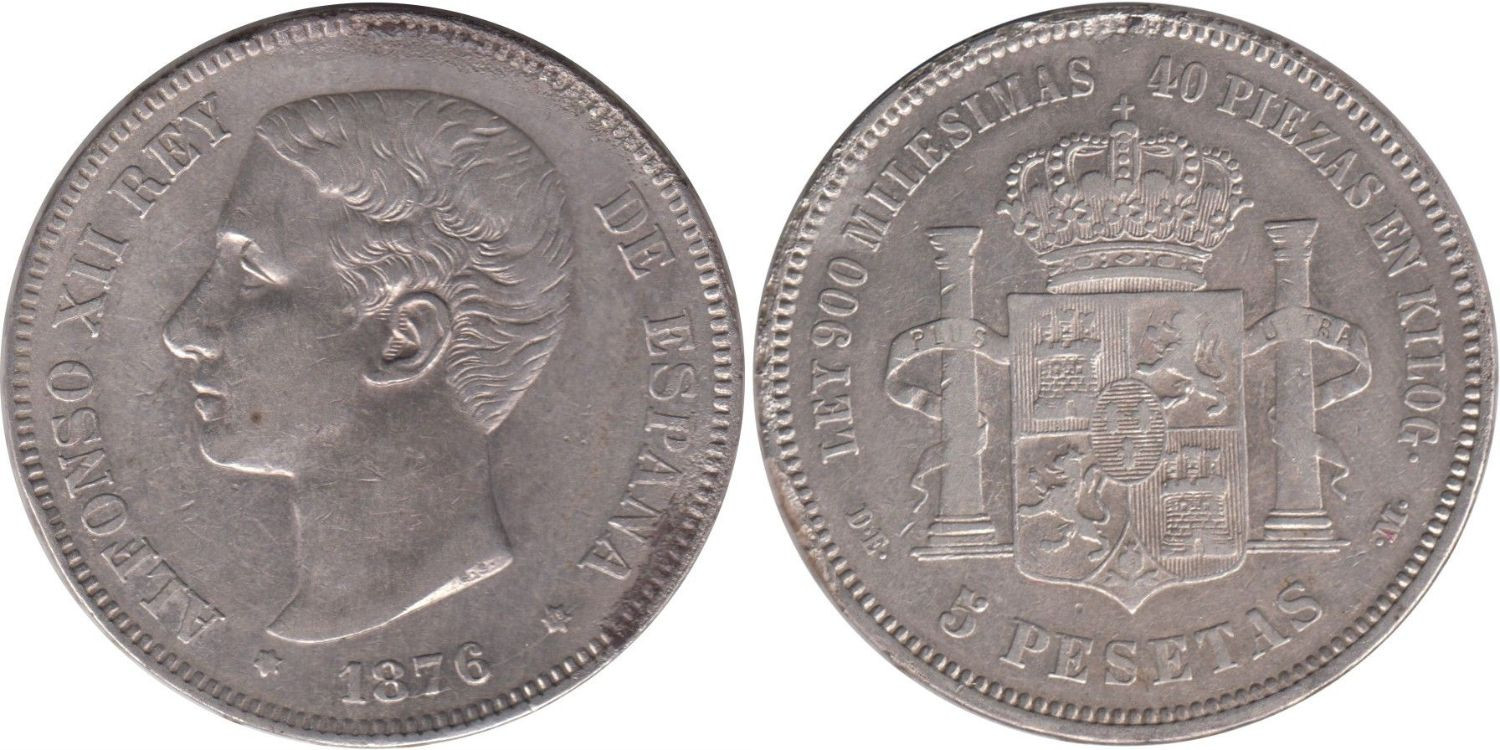 Plata(Ag.) 24,95g MBC 5 Pesetas 1875 (18-76) DEM - Variante pabellón de la oreja rallado
