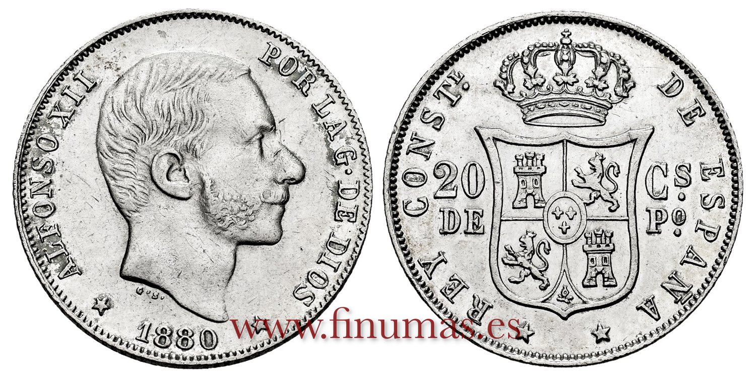 ALFONSO XII . 20 Centavos de Peso. (Ar. 5,00g/23mm). 1880. Manila. (Cal.103). EBC+/SC-. Brillo Original. Muy rara y mas en esta expectacular conservación