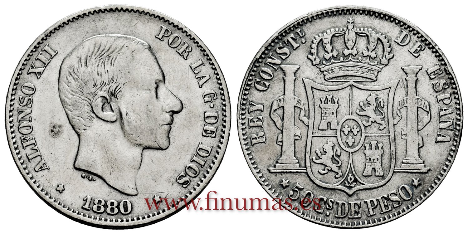 ALFONSO XII . 50 Centavos de Peso. (Ar. 12´83g/30mm). 1880. Manila. (Cal.112). Ligeras lineas de limpieza en anverso. BC+.
