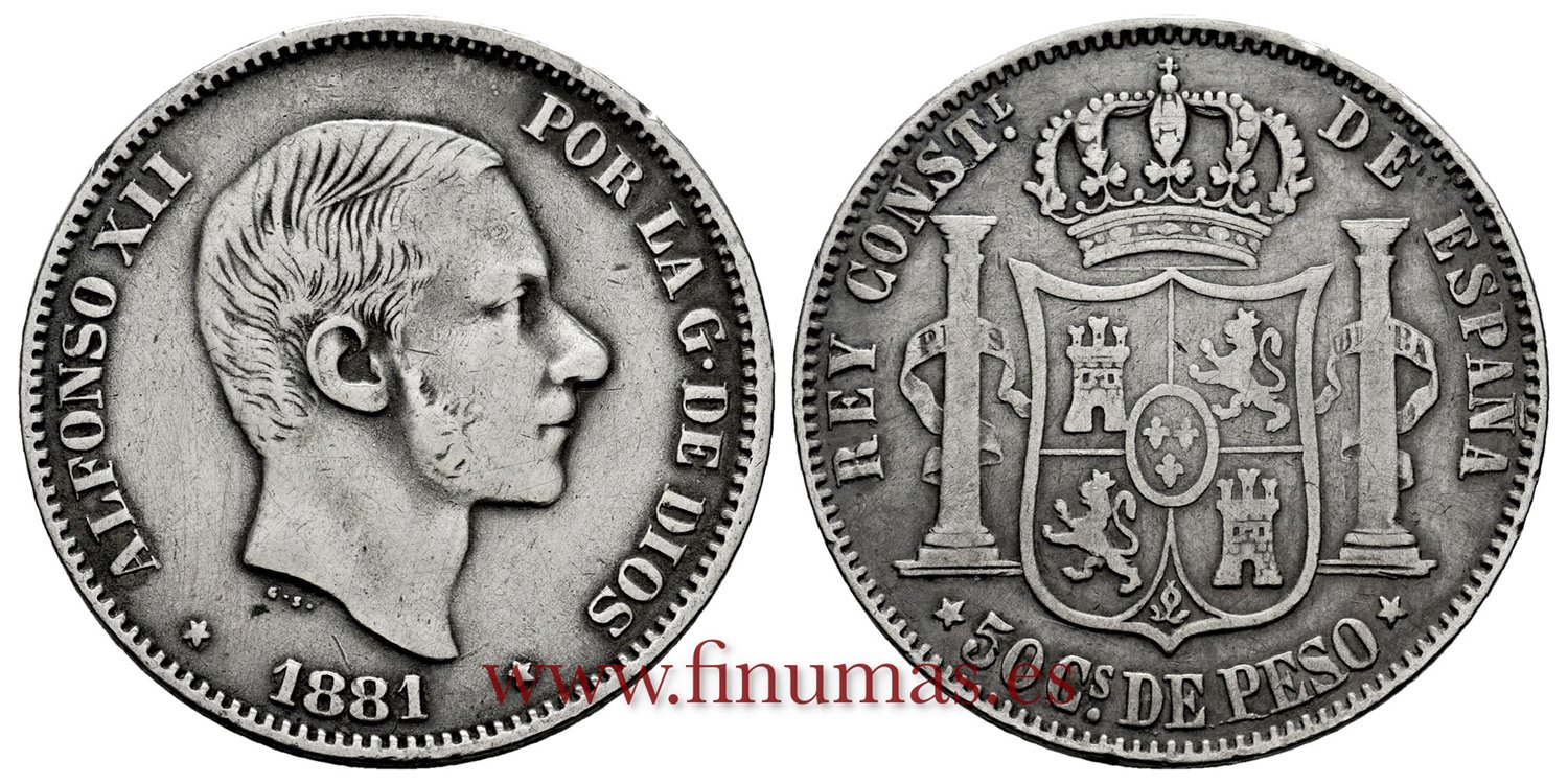 ALFONSO XII . 50 Centavos de Peso. (Ar. 12´63g/30mm). 1881. Manila. (Cal.114). BC+.