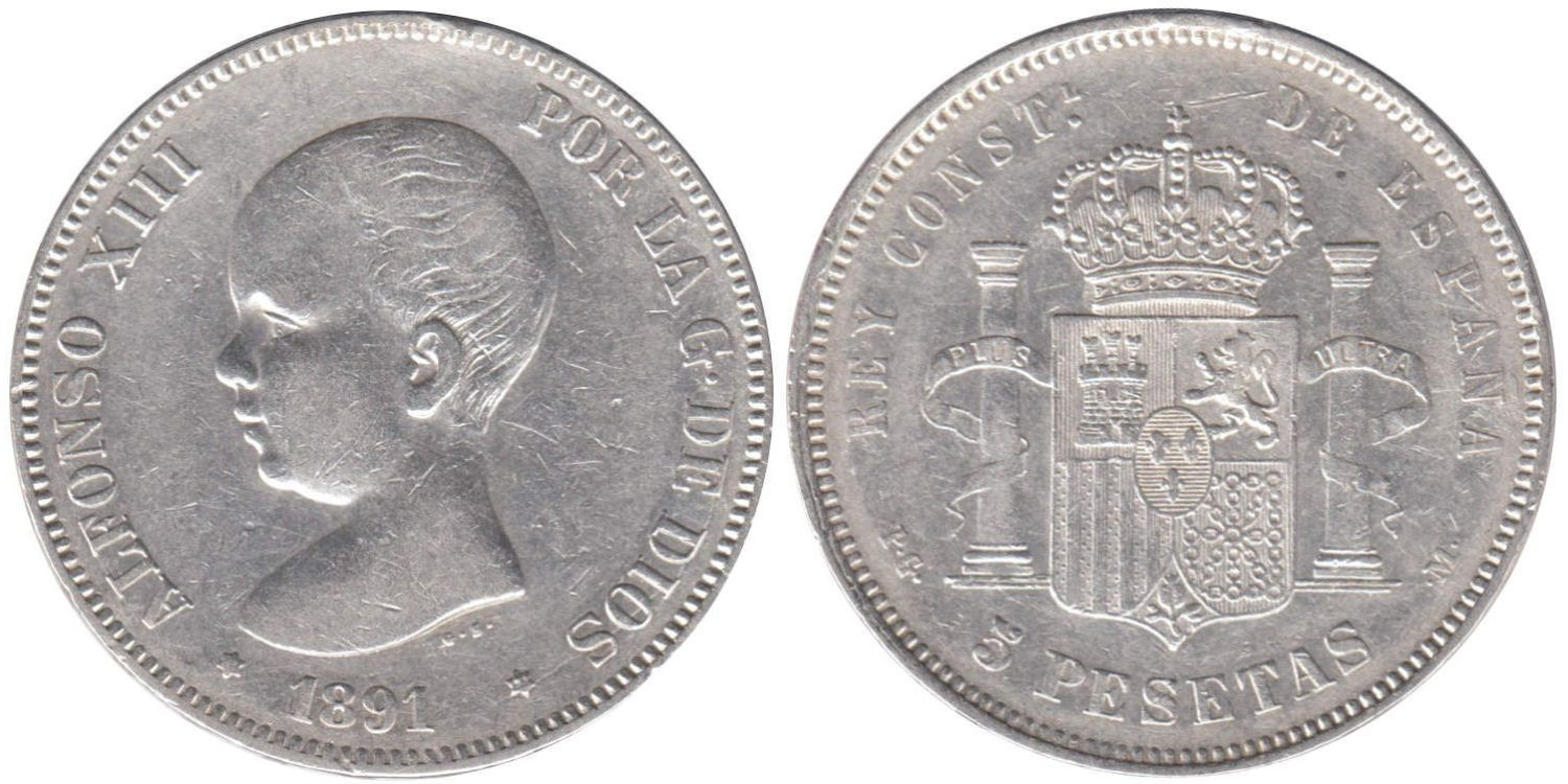 5 Pesetas 1891 (18-91) PGM - Madrid - plata, MBC