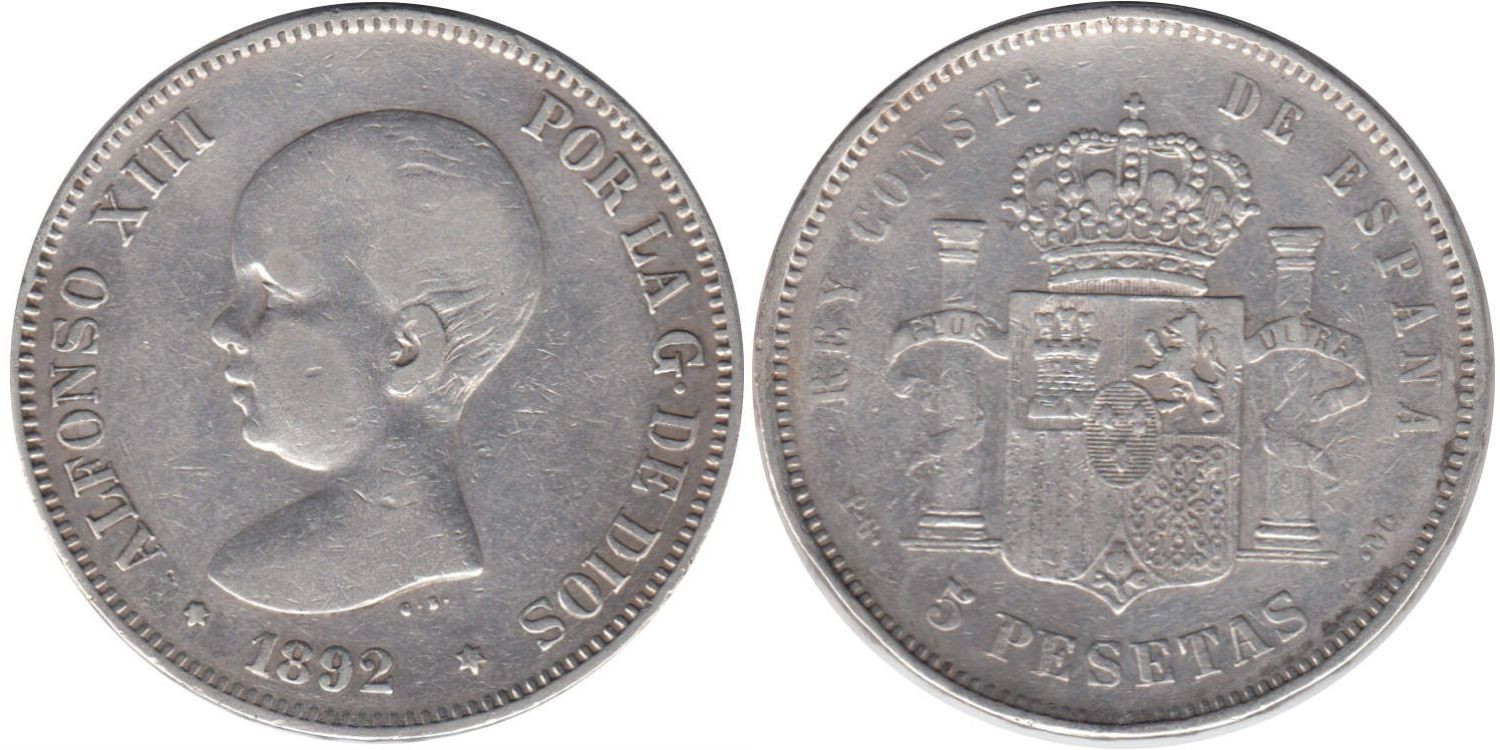 5 Pesetas 1892 (---) PGM pelón - Madrid - plata, MBC-