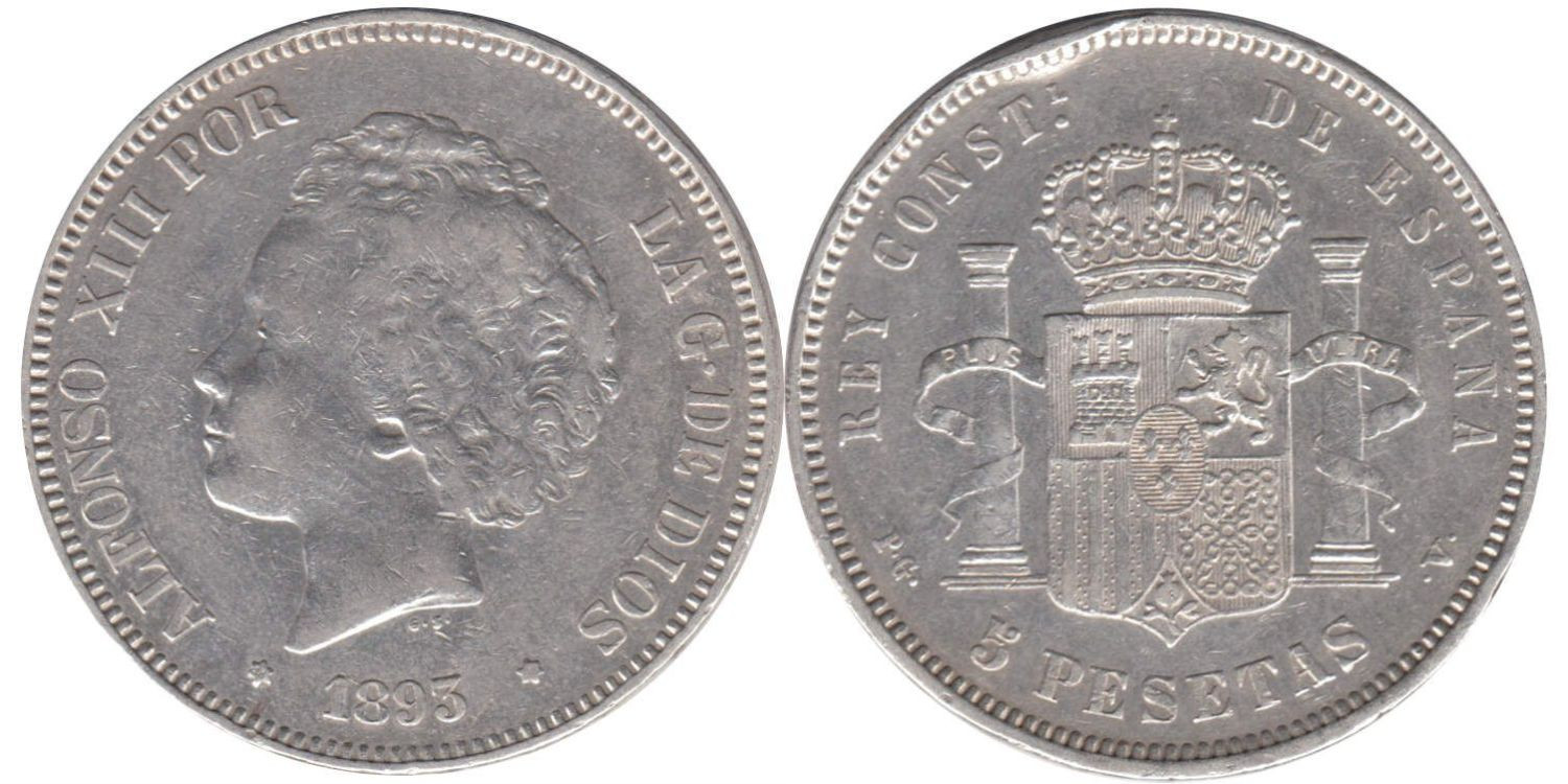 5 Pesetas 1893 (18-93) PGV - Madrid - plata, MBC golpes canto