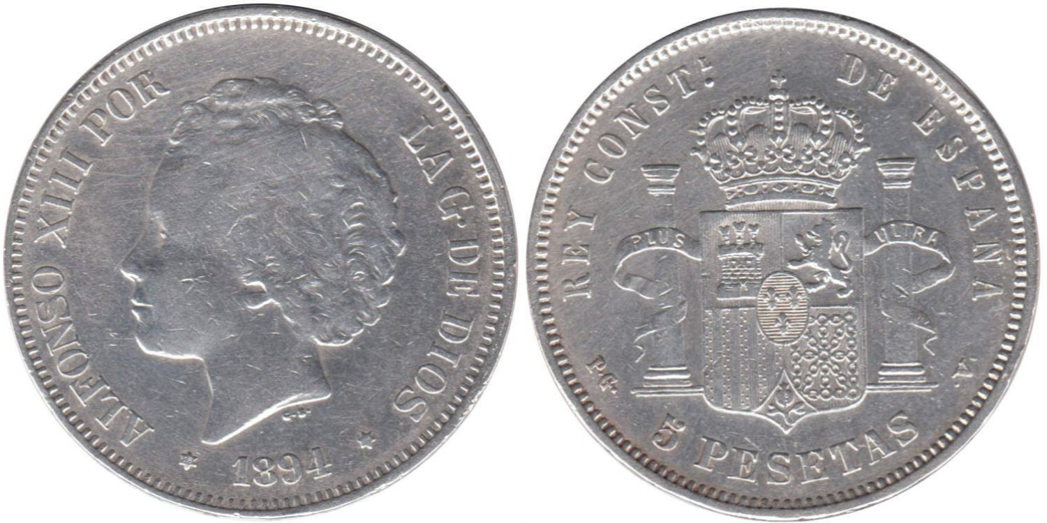 5 Pesetas 1894 (18-94) PGV - Madrid - plata, MBC