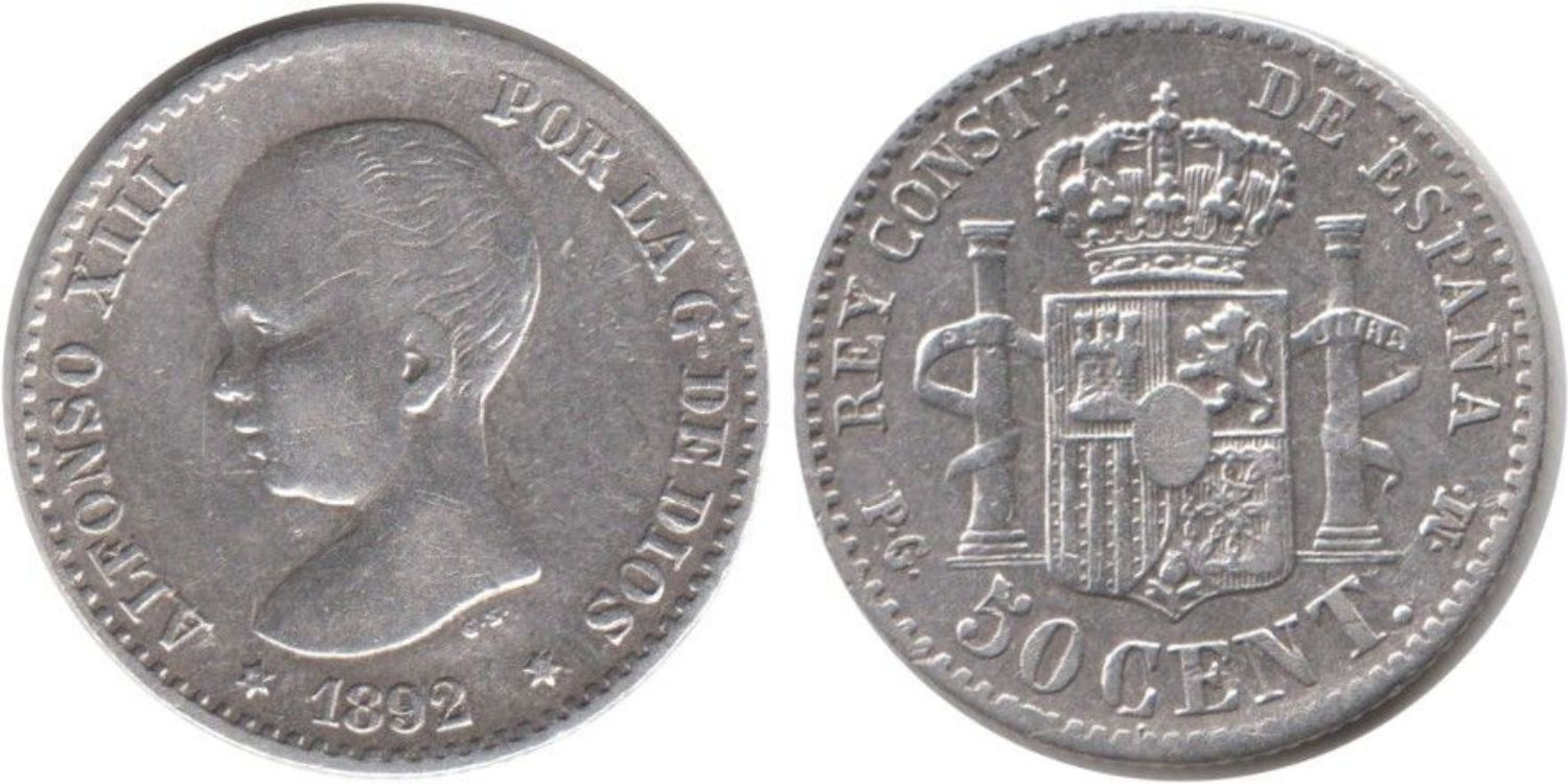 Cy16658E.-ALFONSO XIII - 50 Céntimos 1892 sobre 89 (9-2) PGM, MBC