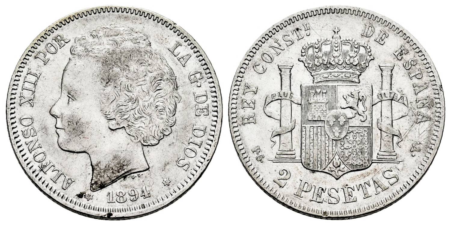 2 pesetas 1894 "bucles". Ligeros scratches a la derecha del escudo. El 4 de la segunda estrella poco marcado. Ligeros restos de brillo original y bonito tono. MBC+/EBC-. Rara en esta conservacion