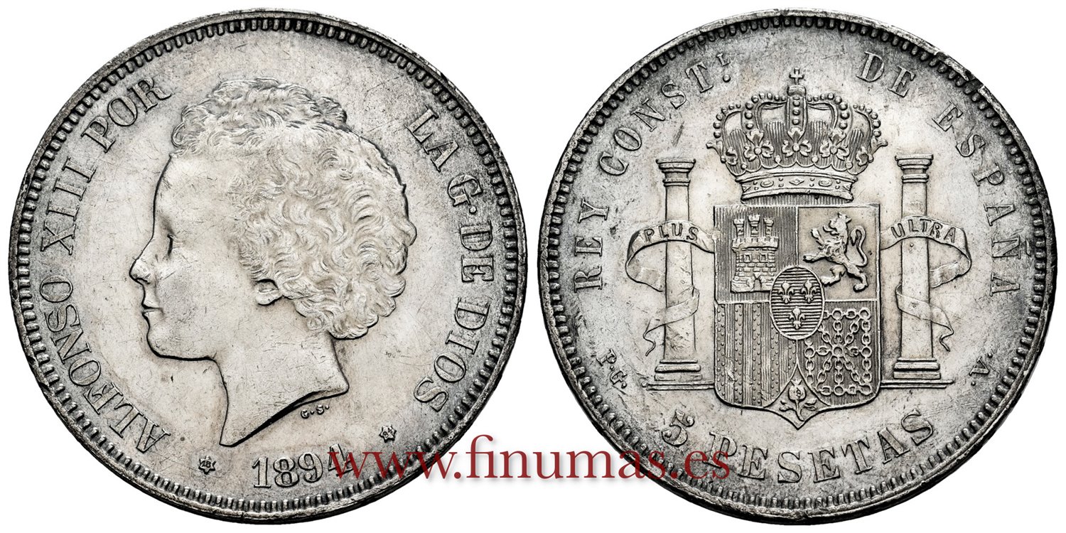 Cy16703H.- ALFONSO XIII 5 Pesetas 1894 (18-94) Bucles PGV - EBC