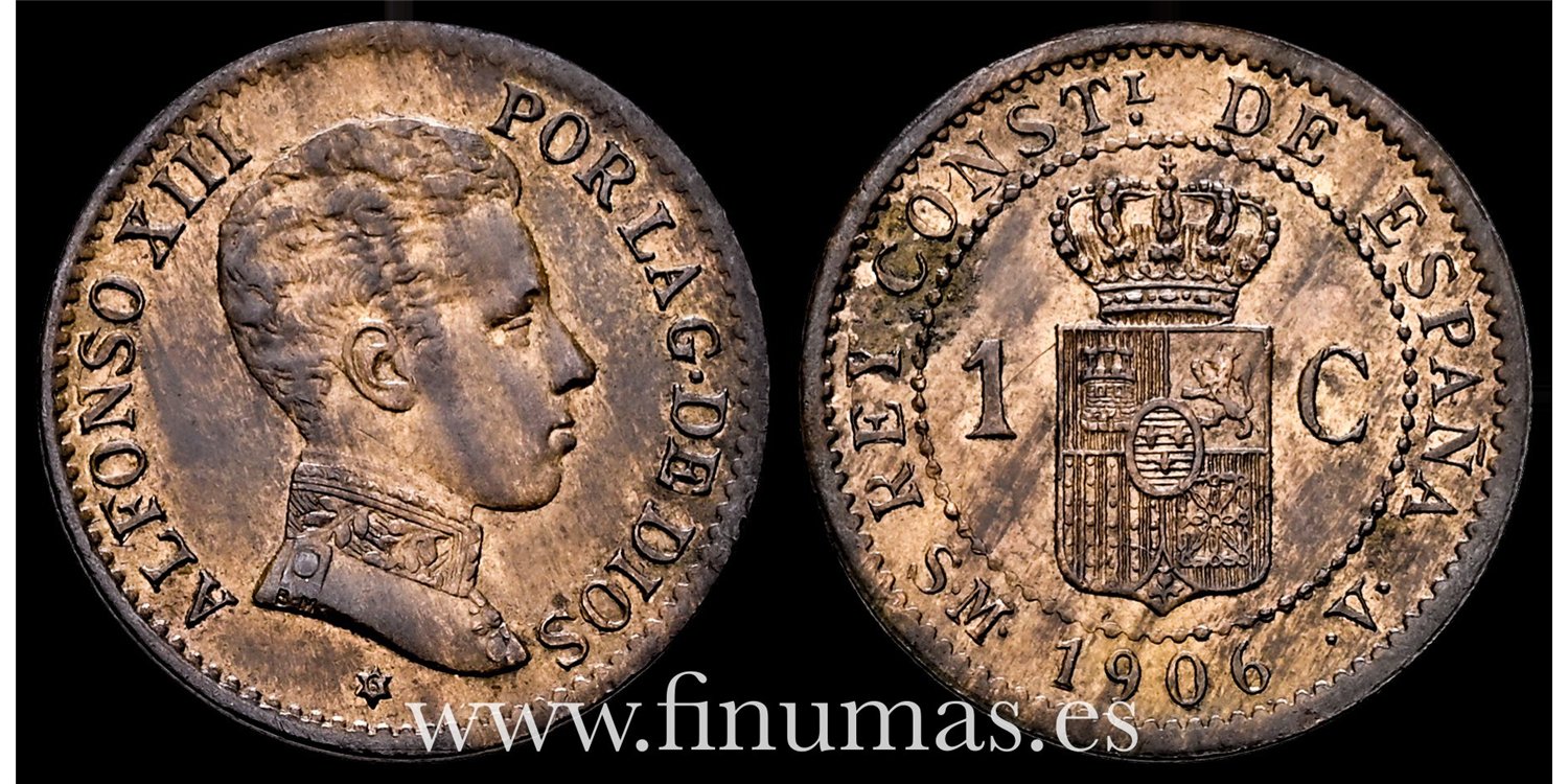 Alfonso XIII (Centenario de la Peseta). 1 céntimo 1906*6. Madrid. SMV. Cobre (Cu). 0,95 g. Patina. EBC Rara.(Cal-1).