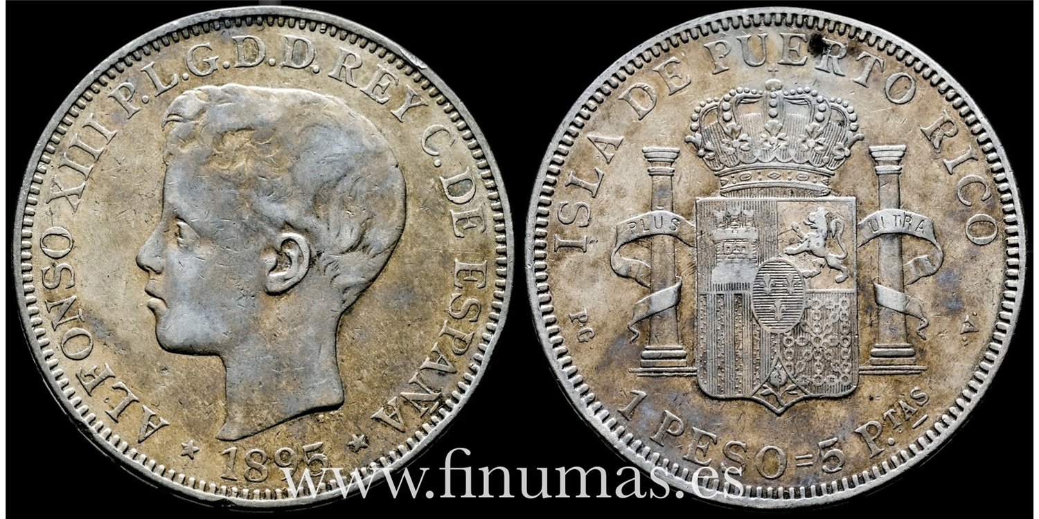 Alfonso XIII 1 peso 1895 Puerto Rico. PGC. . Ag. 24,61 g. Pátina con ligeros tonos azulados sobre brillo original. Rara. MBC+. (Cal-128)