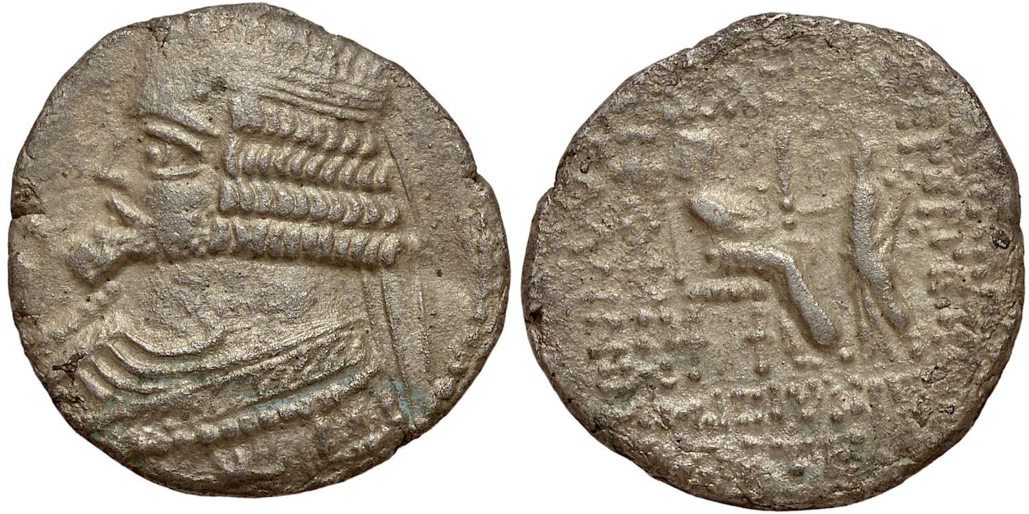 Tetradracma de plata acuñado en Seleucia entre el 29/25 a.C. ANV: Busto del rey a izquierdas barbado con cabeza descubierta y diadema. Alrededor puntos REV: Rey ¿Arsakes I? sentado a la derecha en el trono, Diosa Fortuna en frente de pie sosteniendo una cornucopia y ofreciendo una rama de palma al rey. Leyenda en 7 líneas alrededor: arriba, BAΣIΛEΩΣ BAΣIΛEΩN, a la derecha : APΣAKOY / EVERΓETOY , abajo: ΔIKAIOY, a la izquierda: EΠIΦANOVΣ / ΦIΛEΛΛHNOΣ, fecha en exergo: (EM)BO ZΠ(C) Plata Ag 13.02gm ø29mm