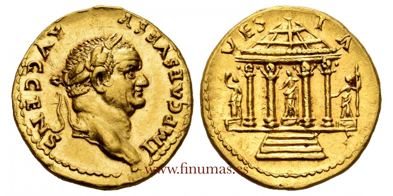 Vespasiano AV Aureus. Roma, 73 d. C. IMP CAES VESP AVG CENS, cabeza laureada a la derecha / VESTA, Templo de Vesta: templo tetrástilo de cúpula redonda con cuatro escalones que conducen a él; estatua de Vesta en el interior, estatua a izquierda y derecha del templo. RIC II.1 549; C. 578; BMCRE 109; Biaggi 341; Calicó 691. 7,26g, 20mm, 12h. Excepcional estado de conservacion. grandes zonas de Brillo Original. Espectacular reverso. EBC+/EBC-