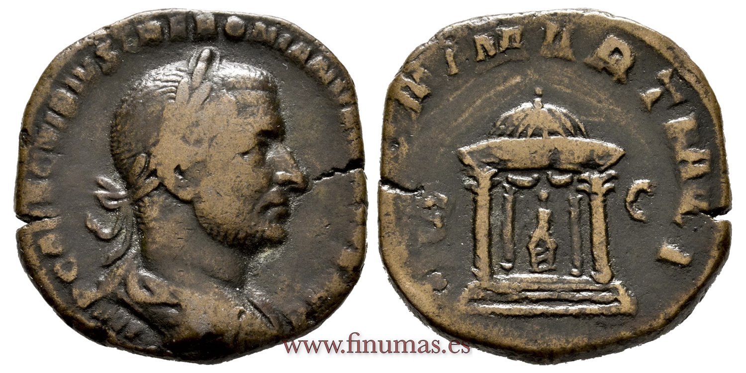 Sestercio de Treboniano Galo. 25-253 d.C. Bronce (Ae) 15´19gm. ANV: IMP CAES C VIBIVS TREBONIANVS GALLVS AVG. REV: Templo con Juno sentada entre colomnas IVNONI MARTIALI. S-C. RIC 112