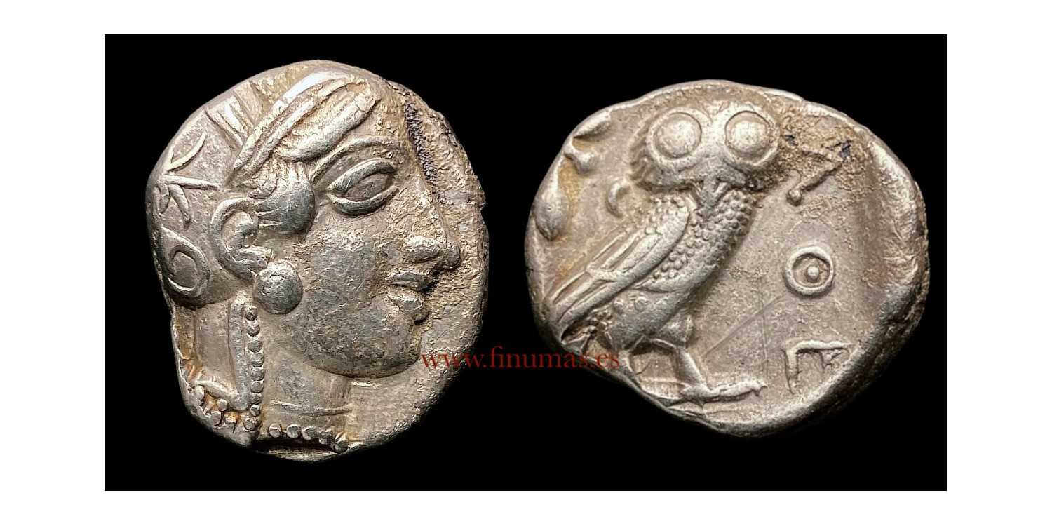 Tetradracma ático. Ceca Atenas. 449-413 A.C. Plata (Ag) 17,10 gr. ø 24mm. Anv: Cabeza de Atenea a derecha, con casco adornado de rama de olivo de tres hojas. Rev: AΘE (Atenas). Lechuza de pie a derecha y mirando al frente. Detras luna menguante y rama de olivo con dos hojas y fruto. Lineas cruzadas delante del mochuelo. MBC.