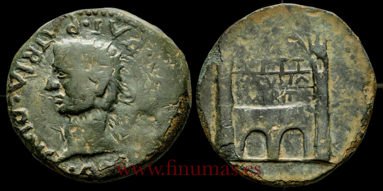 Emerita Augusta Dupondio acuñado bajo reinado de Tiberio. 14-36 d.C. en Mérida (Badajoz). Flan Grande de 35mm. Bronce (Ae.) 21,87gm. Anv.: Cabeza laureada de Tiberio a izquierda TI. CAESAR. AVGVSTVS. PATER. PATRIAE. Rev.: Puerta, sobre ella AVGVSTA. EMERITA. ESCASA