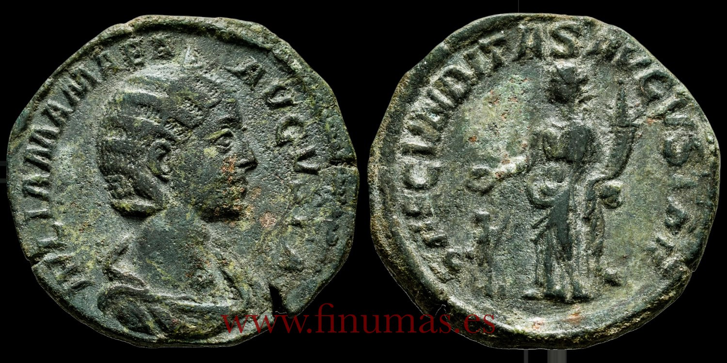 Julia Mamea. Sestercio 222-235 d.C. Roma Bronce (Ae) 19,80gm ø30 mm Anv:.IVLIA MAMAEA AVGVSTA, busto con diadema y drapeado hacia la derecha. Rev.: FECVNDITAS AVGVSTAE S-C. Fecunditas de pie a la izquierda, sosteniendo una cornucopia y extendiendo la mano hacia un niño de pie a la derecha. RIC IV 668 (Severo Alejandro); BMC 920; Cohen 8 .