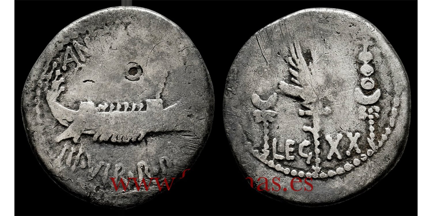 MARCO ANTONIO. Denario "Legionario" 32-31 a.C. Ceca móvil . Plata (Ag.) 3,20gm. Anv: Galera Pretoriana a derecha; ANT. AVG III VIR. R. P. C. Rev.: Aquila entre dos signa; LEG XX. BC+ Contramarcas. (CRAW-544.36. FFC-59. )