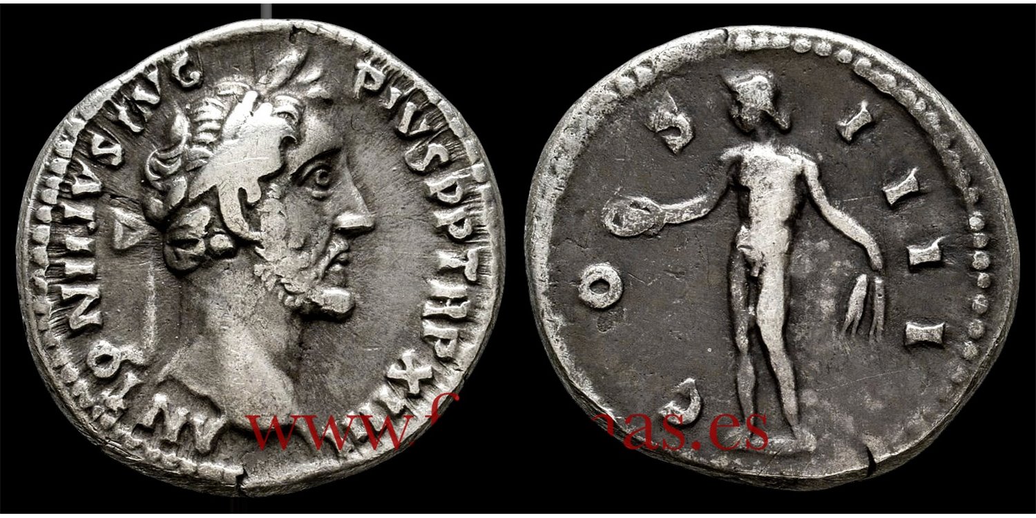ANTONINO PÍO. Denario 150-151 d.C. Roma. Plata (Ag) 3,47gm. Anv.: Cabeza laureada a derecha; ANTONINVS AVG PIVS P P TR P XIIII. Rev.: Genio a izquierda con espigas y pátera; COS IIII. MBC. (RIC-196.)