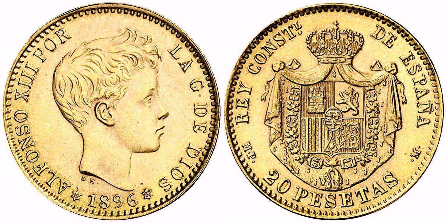 Reacuñación oficial de 20 pesetas de oro de Alfonso XIII. Año 1896 *19 62. Cal. 8. Madrid.