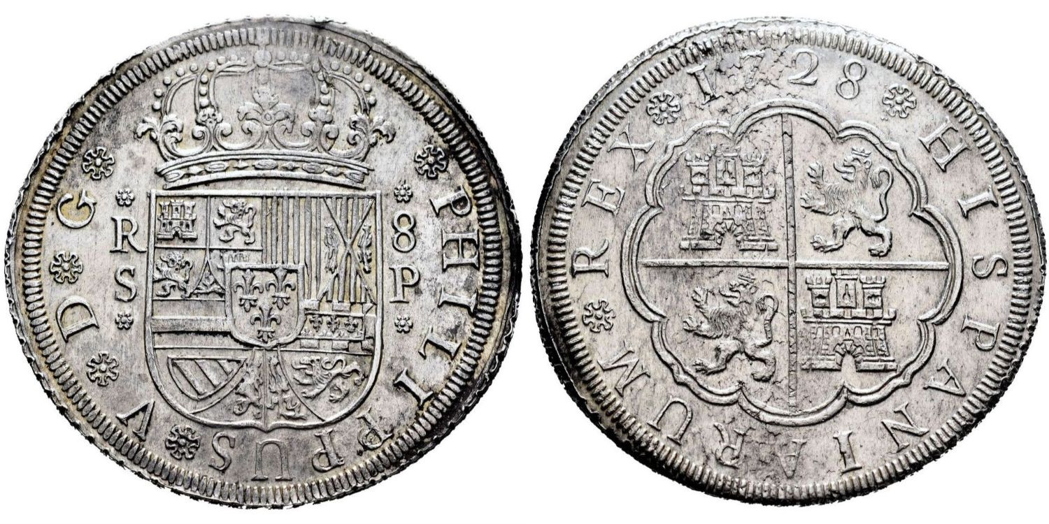 FELIPE V 1728. P. 8 reales. Sevilla. Acuñación a rodillo.