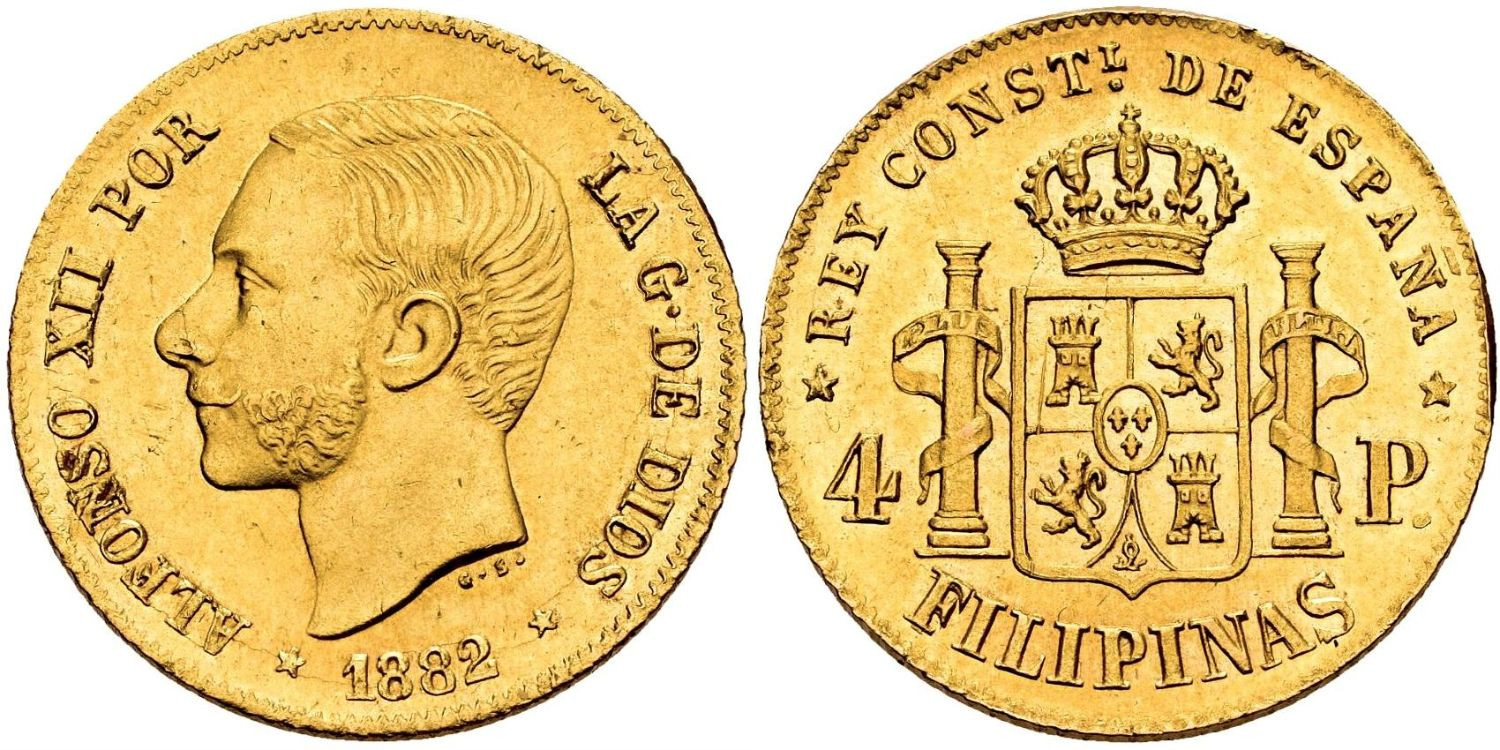 4 pesos. 1882. Manila. (Cal-127). Au. 6,82 g. Espectacular reverso con pleno brillo original. Rarísima en esta conservación. Sin Circular