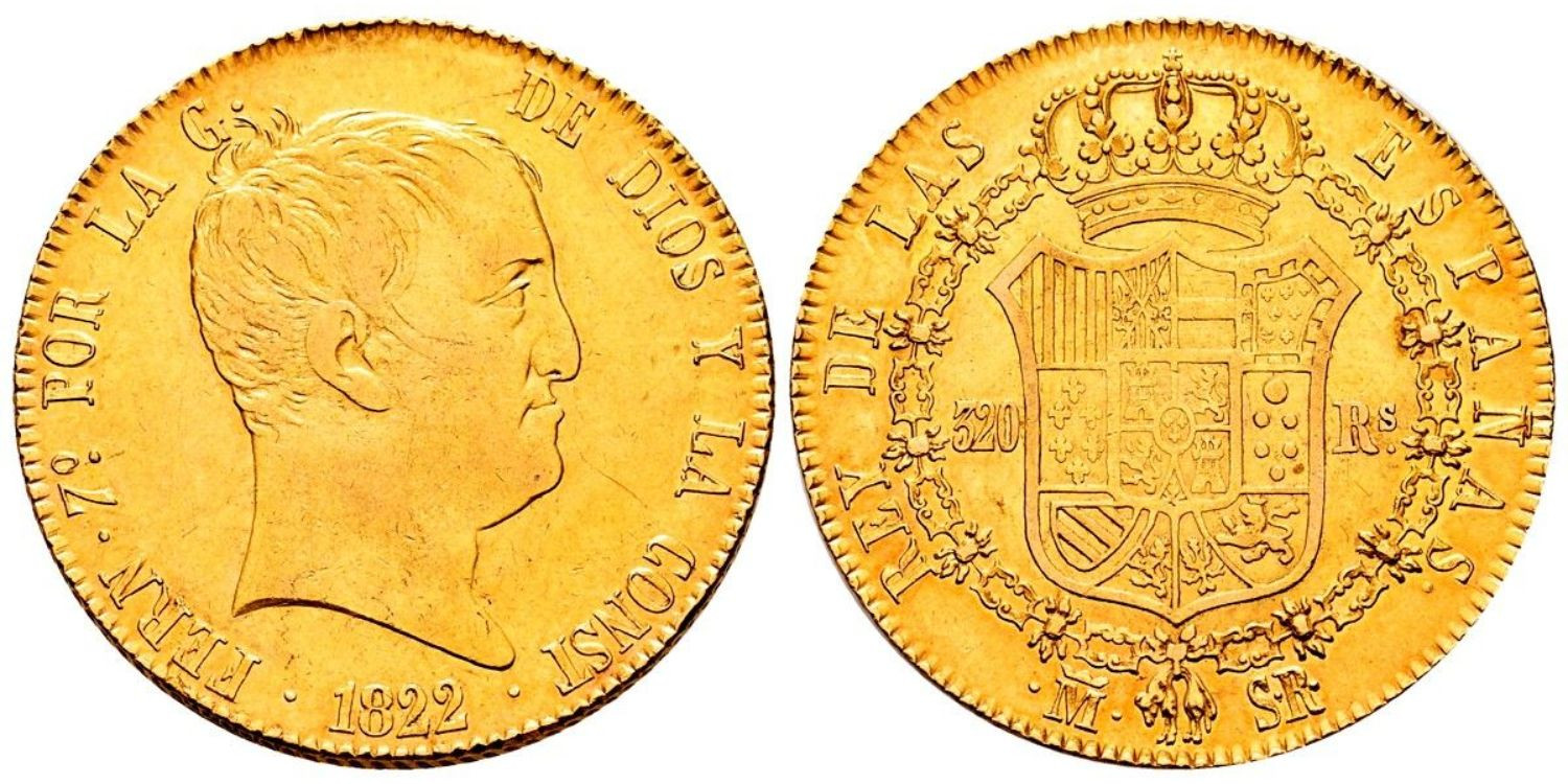 1822. Fernando VII. Madrid. SR. 320 reales. . 27,02 g. Tipo "cabezón". Alguna marquita. Muy bella y mas en mano. Brillo original. Muy rara y más así. EBC