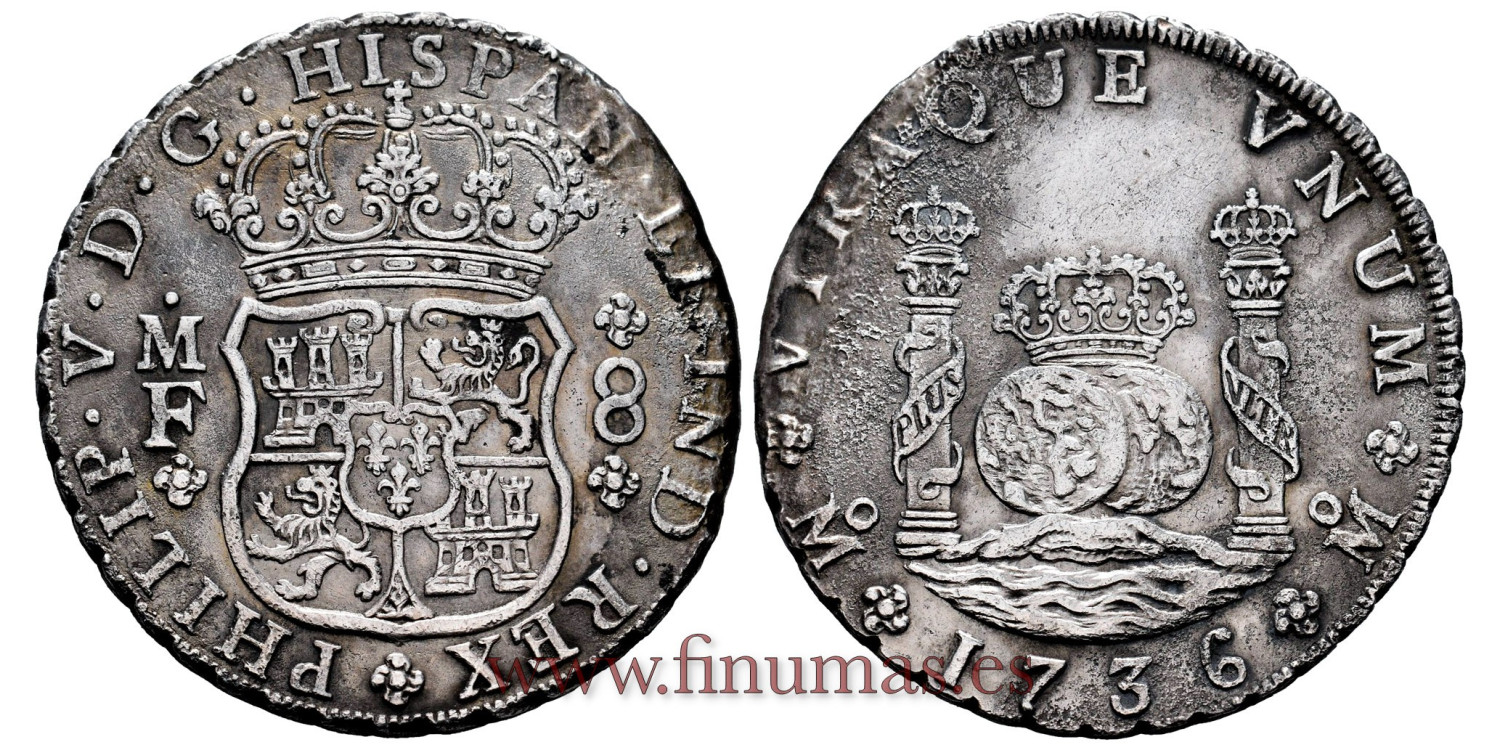 FELIPE V 1736. 8 reales columnario. México. Plata (Ag). Curiosa pieza, probablemente procedente de Naufragio. Oxidaciones marinas parciales cn ligera perdida de masa en el campo izquierdo al anverso.25'84 gr. Resto de la pieza destaca por un alto grado de conservación (EBC/EBC+). Bonito tono.
