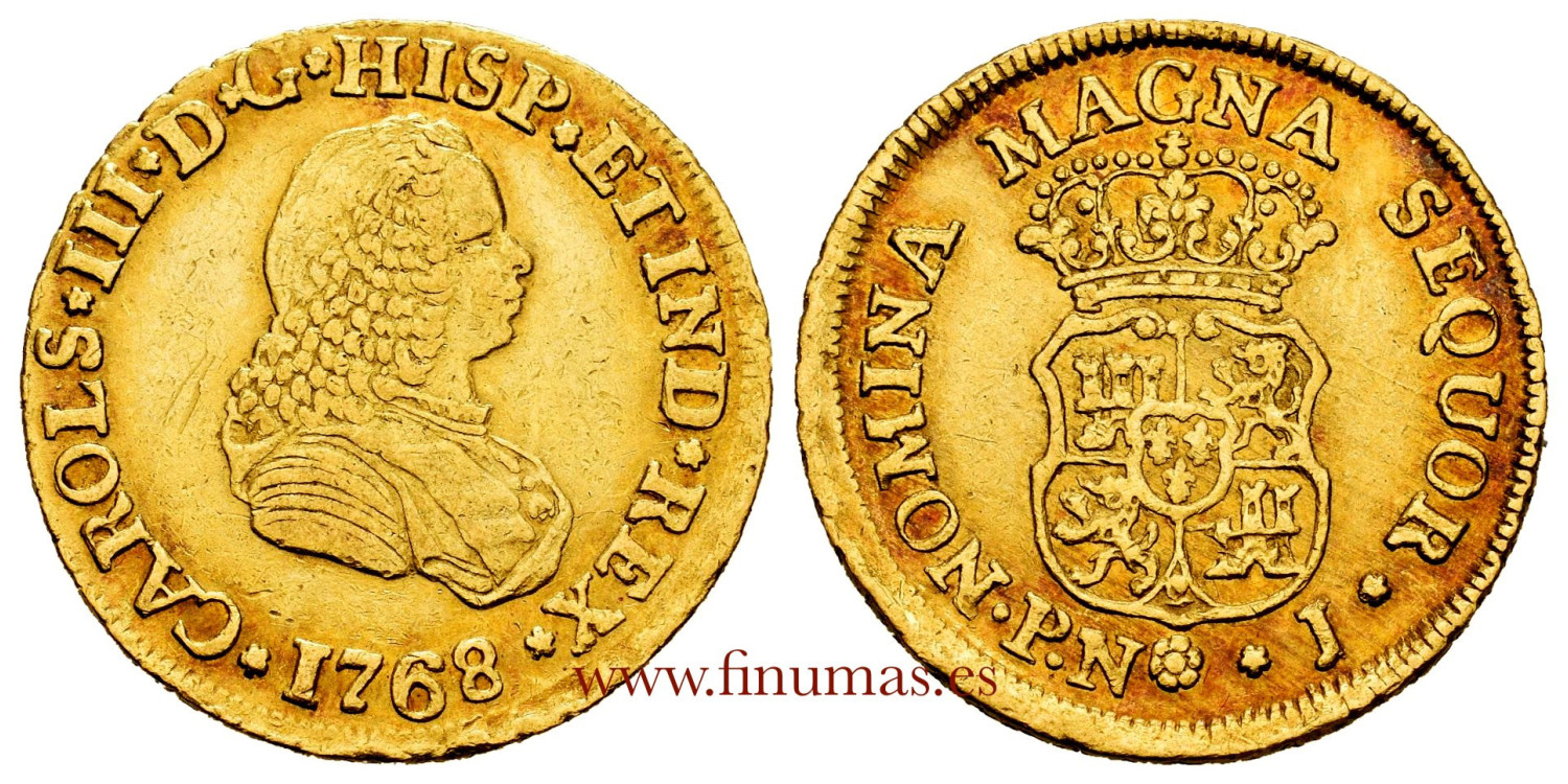 1768. Carlos III. Popayán. J. 2 escudos. (Cal. 498) (Restrepo 58-12). 6,64 g. Busto de Fernando VI. Bonita pátina rojiza y restos de brillo original. Rara. MBC+/EBC-