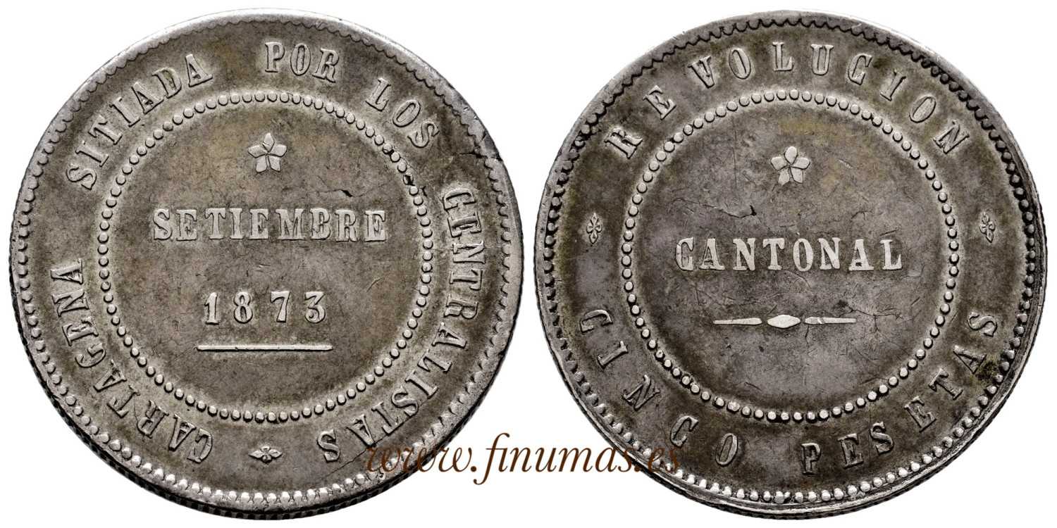 Revolución Cantonal. 5 pesetas. 1873. Cartagena (Murcia). (Cal-7). Ag. 28,83 g. Reverso Coincidente sobre el eje vertical. MBC/MBC+