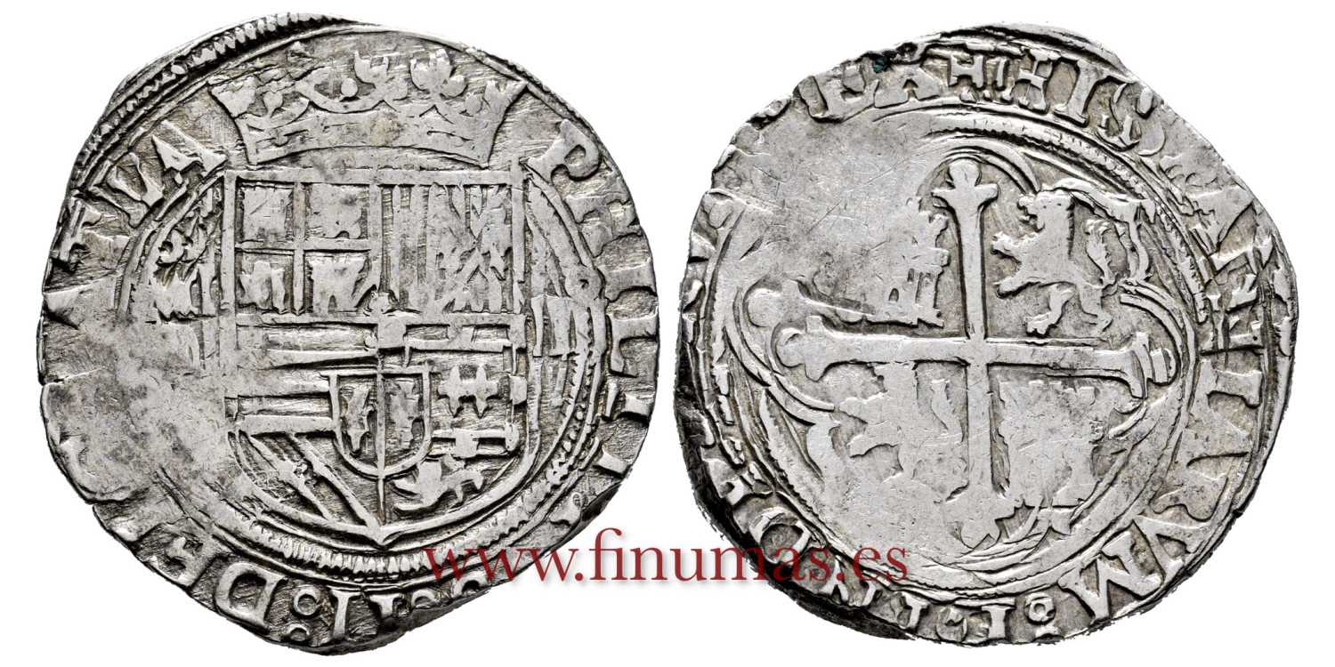 4 reales Felipe II. Mexico -O. Ceca y ensayador en vertical a la izquierda. Valor a la derecha. Leyendas parcialmente visibles, incluyendo nombre y ordinal del rey.Ag. 13'38gm ø33mm. Escasa