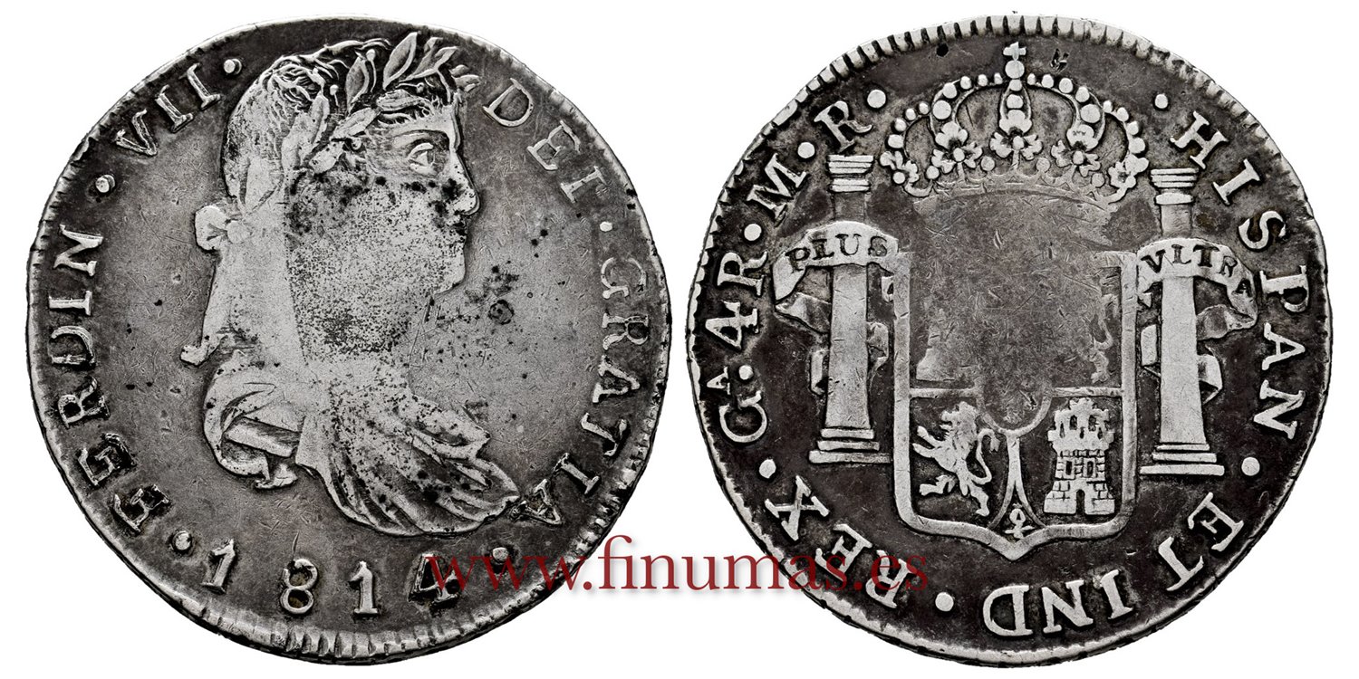 Fernando VII. 4 reales 1814. Guadalajara. MR. VARIANTE . (AC. 1039 var). 12,45 g. Variante corona de laurel, con puntos (Calico no la recoge, Cayon no la Recoge.). Vano central.. Rara. MBC