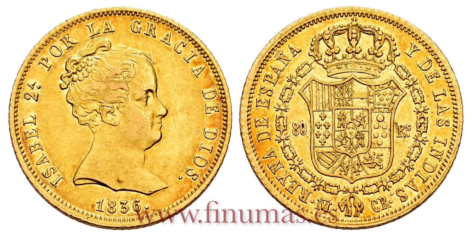 Isabel II. 80 reales. 1836. Madrid. CR. (Cal-720). Au. 6,76 g. Bonito tono y gran parte del Brillo Original, sobre todo en el reverso. EBC/EBC+