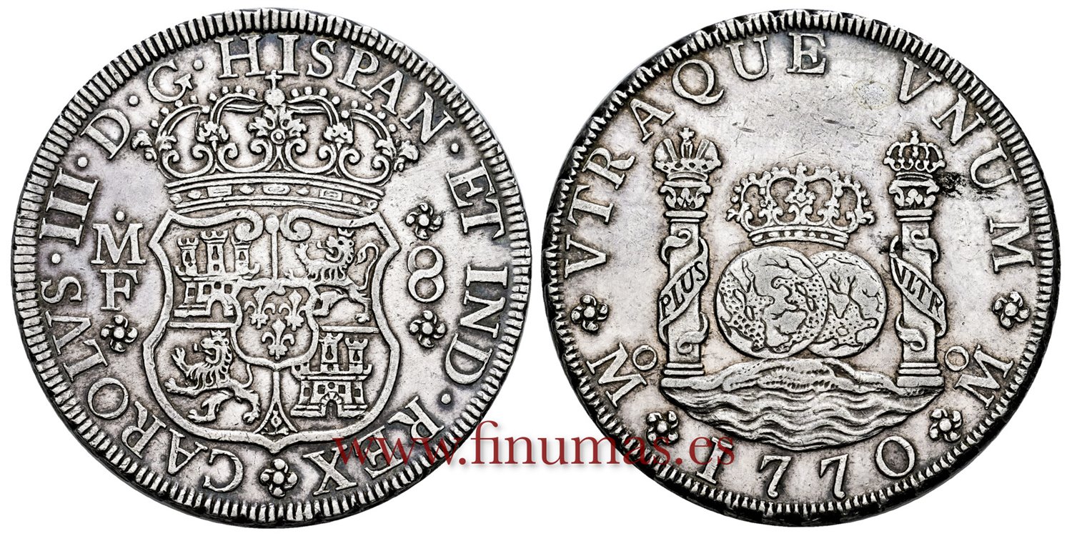 Carlos III. 8 reales. 1770. México. MF. (Cal-1099). Ag. 26,95 g. EBC/EBC+ Bonita Patina oscura sobre restos de Brillo Original