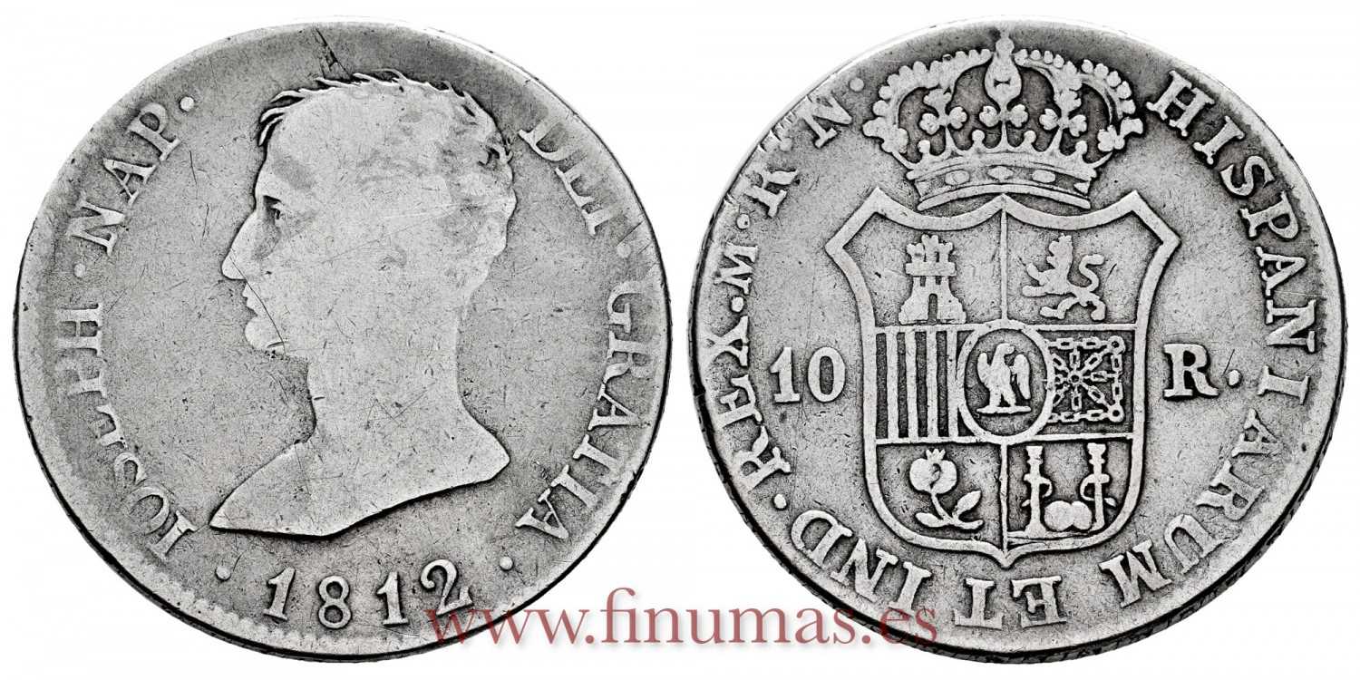 José Napoleón 10 reales. 1812. Madrid. RN. (Cal-30). Ag. 13,19 g. Dos mundos entre las columnas. Rara.