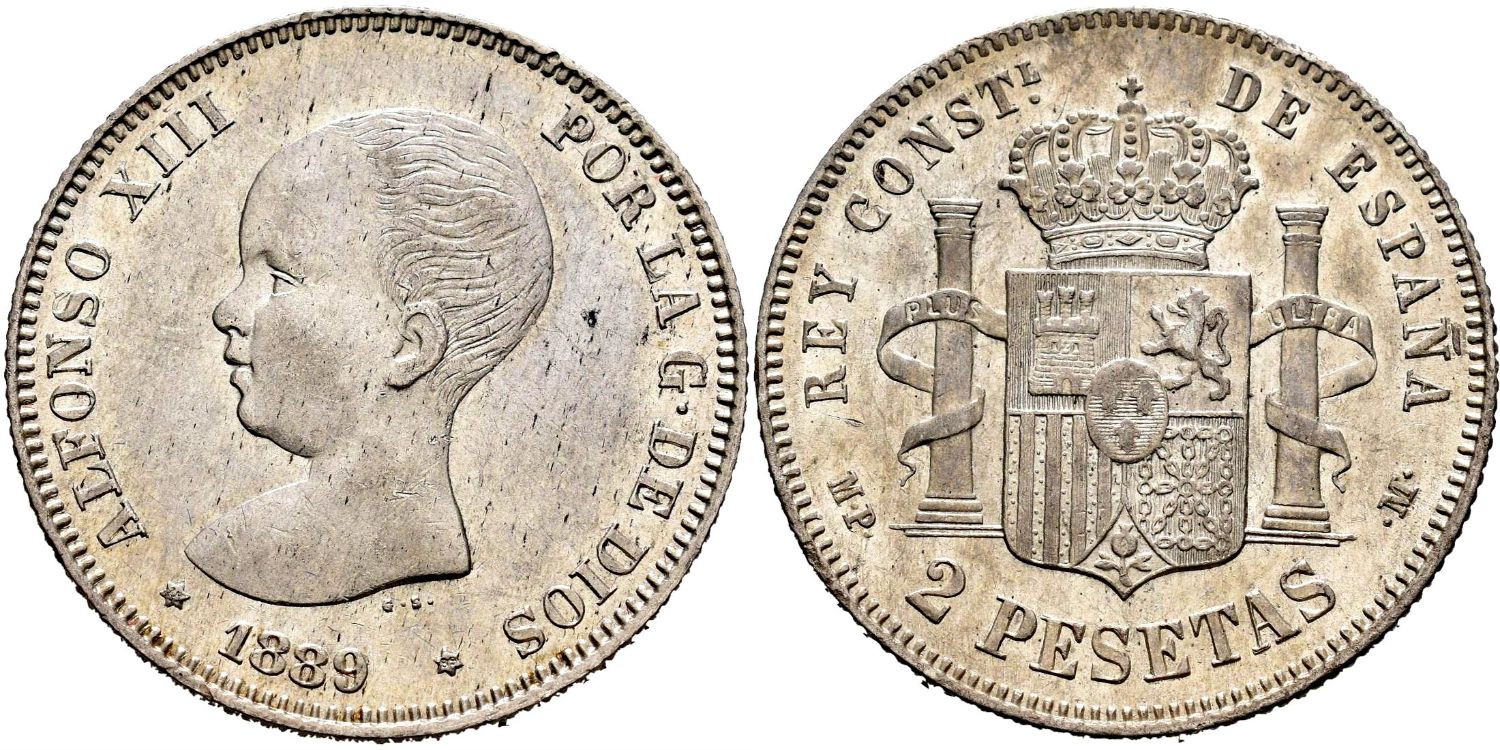 Centenario de la Peseta Alfonso XIII 2 pesetas. 1889*18-89. Madrid. MP M. (Cal-82). Ag. 9,94 g. Precioso tono de monetario Sobre Brillo original. EBC+/SC-. Encapsulada por NGC como AU58. Tan solo 1 pieza en calidad superior en todo el censo de NGC