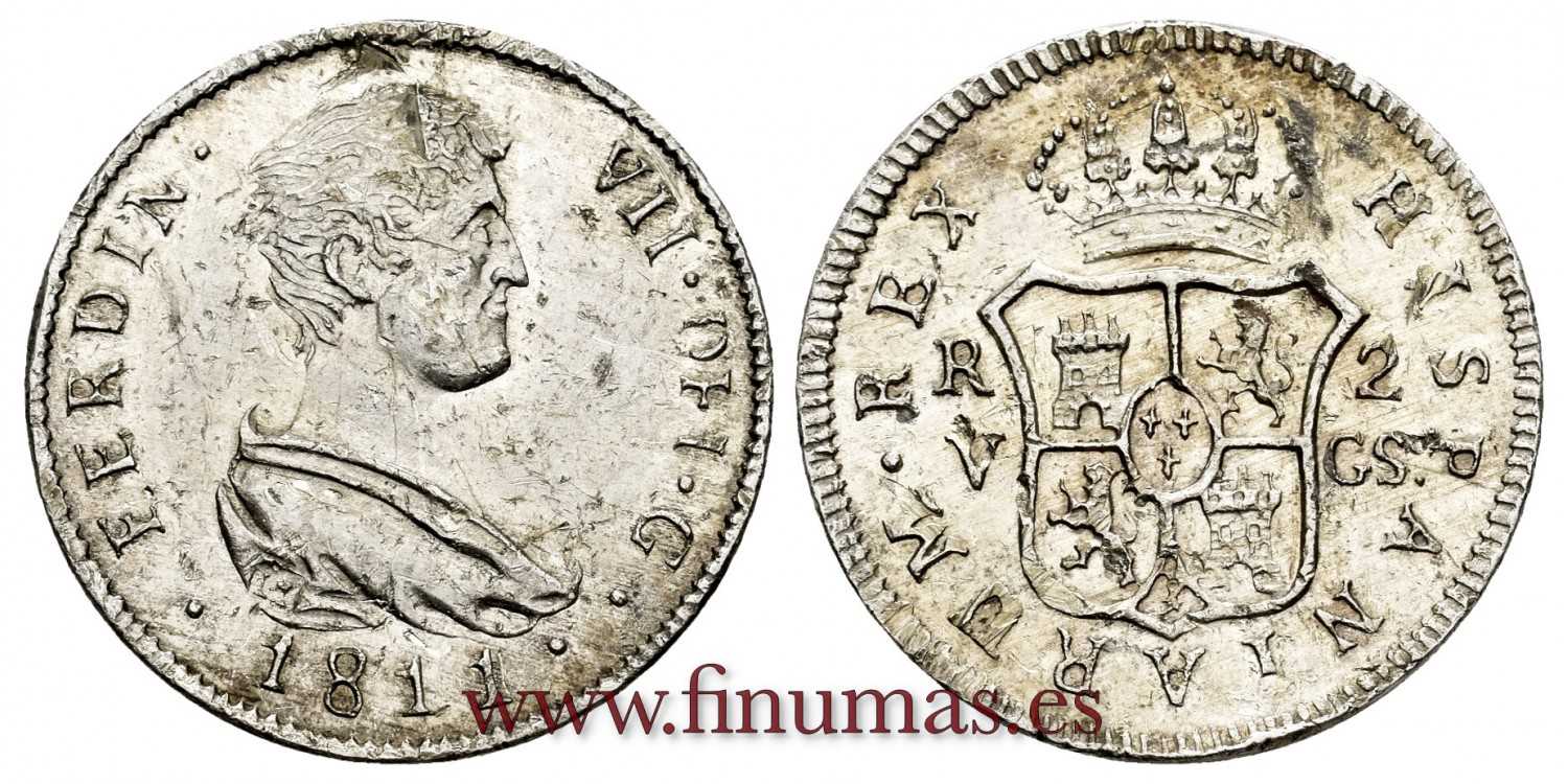 Curiosa pieza tipo 2 reales de Fernando VII . 1811. Valencia. G.S. (tipo Cal-991). Bajo peso 3,78 g Plata (Ag) y modulo ø22mm. Sin Circular, con acuñacion parcialmente defectuosa y numerosas marcas de maquinaria. Pleno brillo original.
