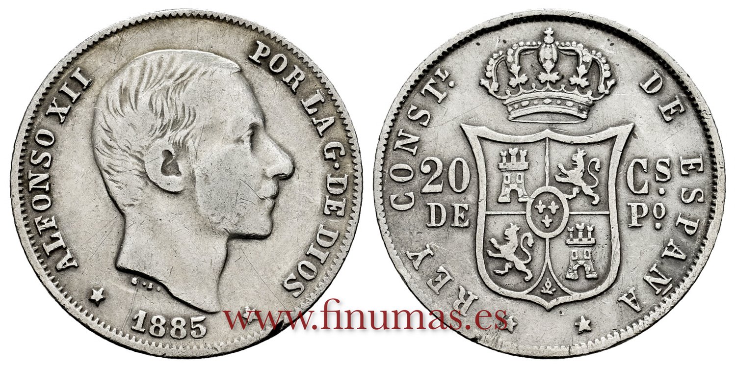 ALFONSO XII . 20 Centavos de Peso. (Ar. 5,03g/23mm). 1885. Manila. (Cal.111). BC
