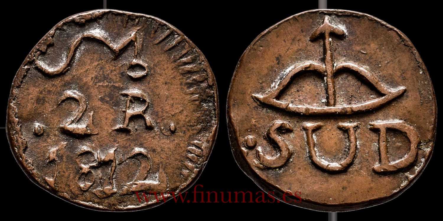 Fernando VII 2 reales 1812 Morelos. Acuñacion de emergencia por los insurgentes. Los "1´s" en arábigo. Cobre (Cu.) 3´73m .Buen ejemplar con muy buen relieve. (Cal-884).