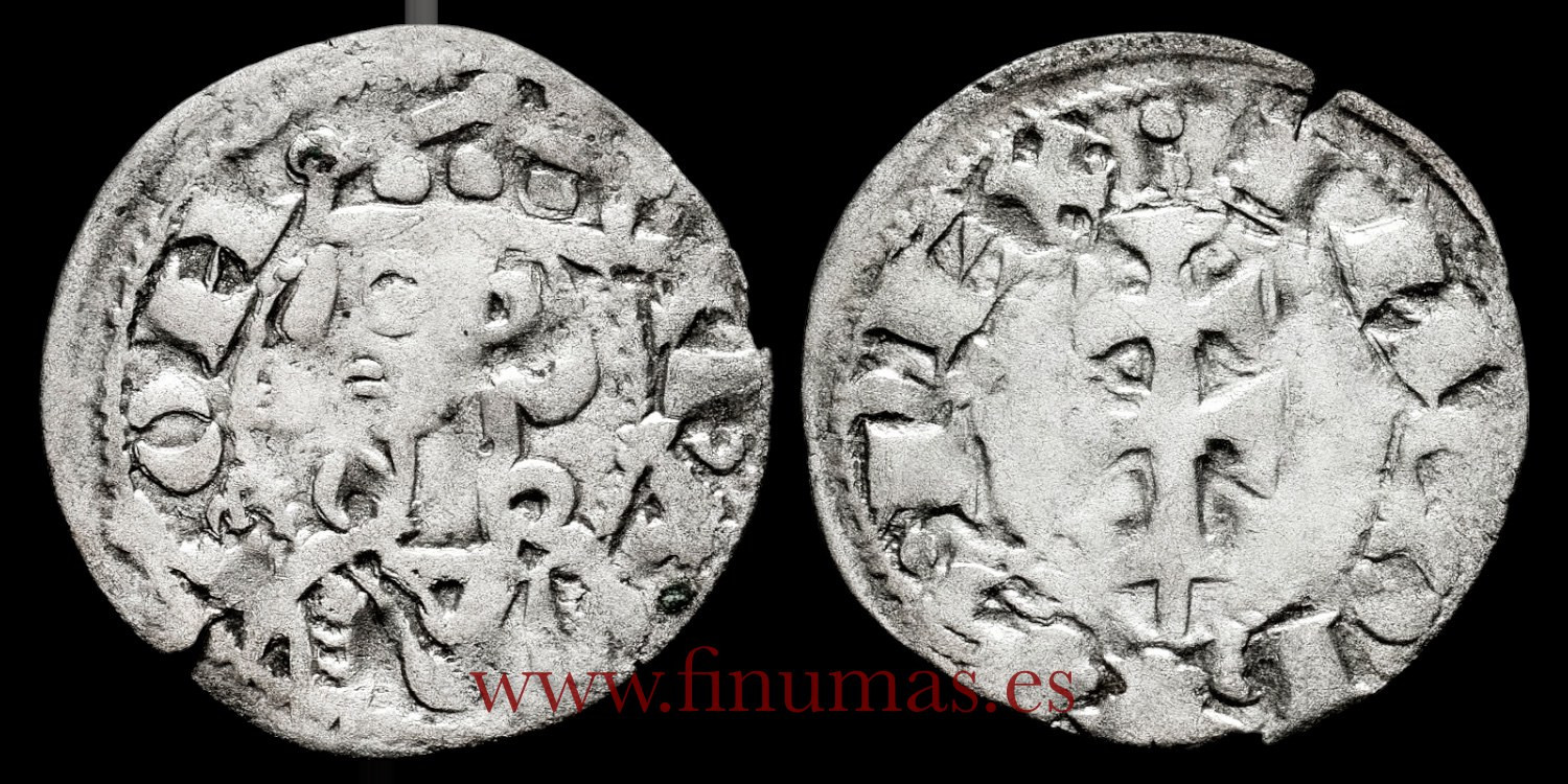 Dinero Jaques Vellon 19 mm. 0,8 gm. Anverso: Rey coronado a izquierda. ARAGON. Reverso: Cruz de doble travesaño. IACOBVS REX