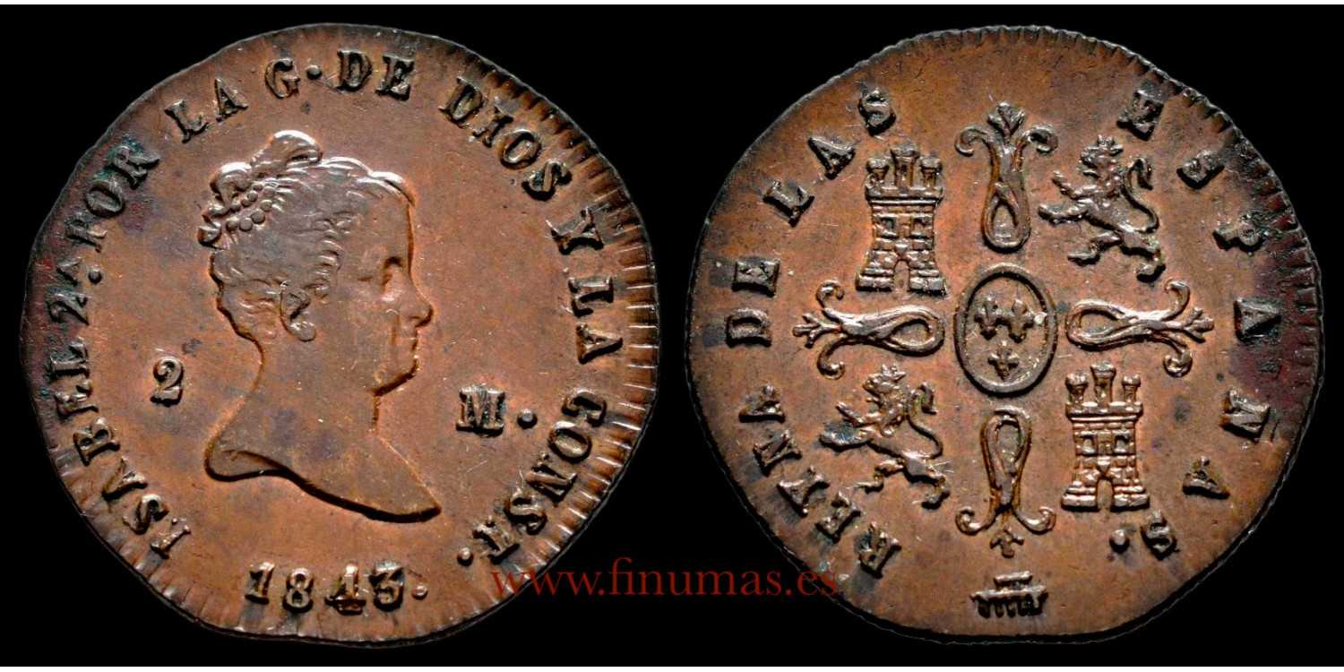 Isabel II 2 maravedís 1843 Segovia Cobre (Cu). 2,46 g. Ligeros restos de verdin. Cospel irregular en la base. EBC+/SC- (Cal-55)