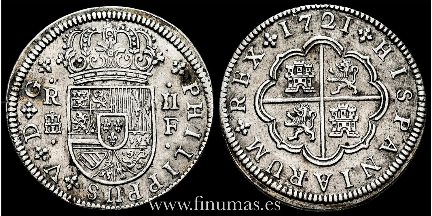 Felipe V 2 reales 1721 Segovia. F. Ag. 5´76 g. Ligeramente alabeo. EBC (Cal-954).