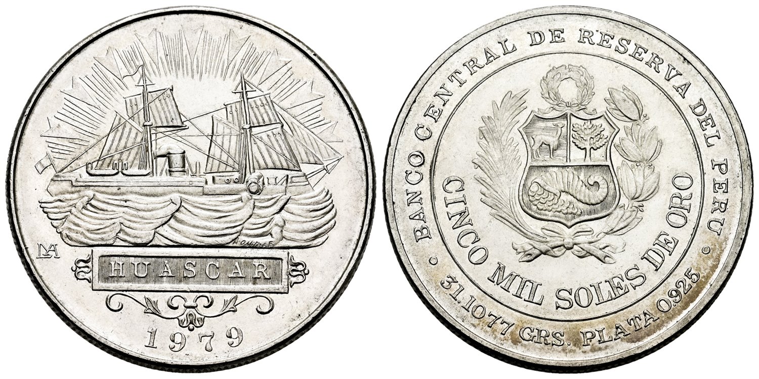 PERÚ. 5000 Soles de Oro. Plata (Ag). 33,74g ø40mm 1979. Lima. Centenario Batalla de Iquique. (Km#276). SC