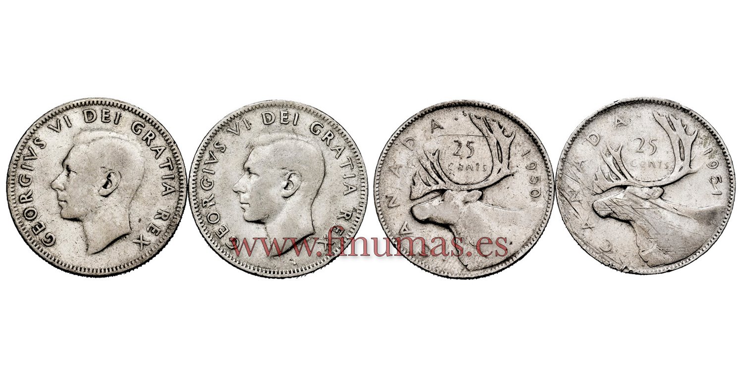 CANADA - K-0044L -LOTE 2 X 25 Centavos 1950 y 51. PLATA - MBC