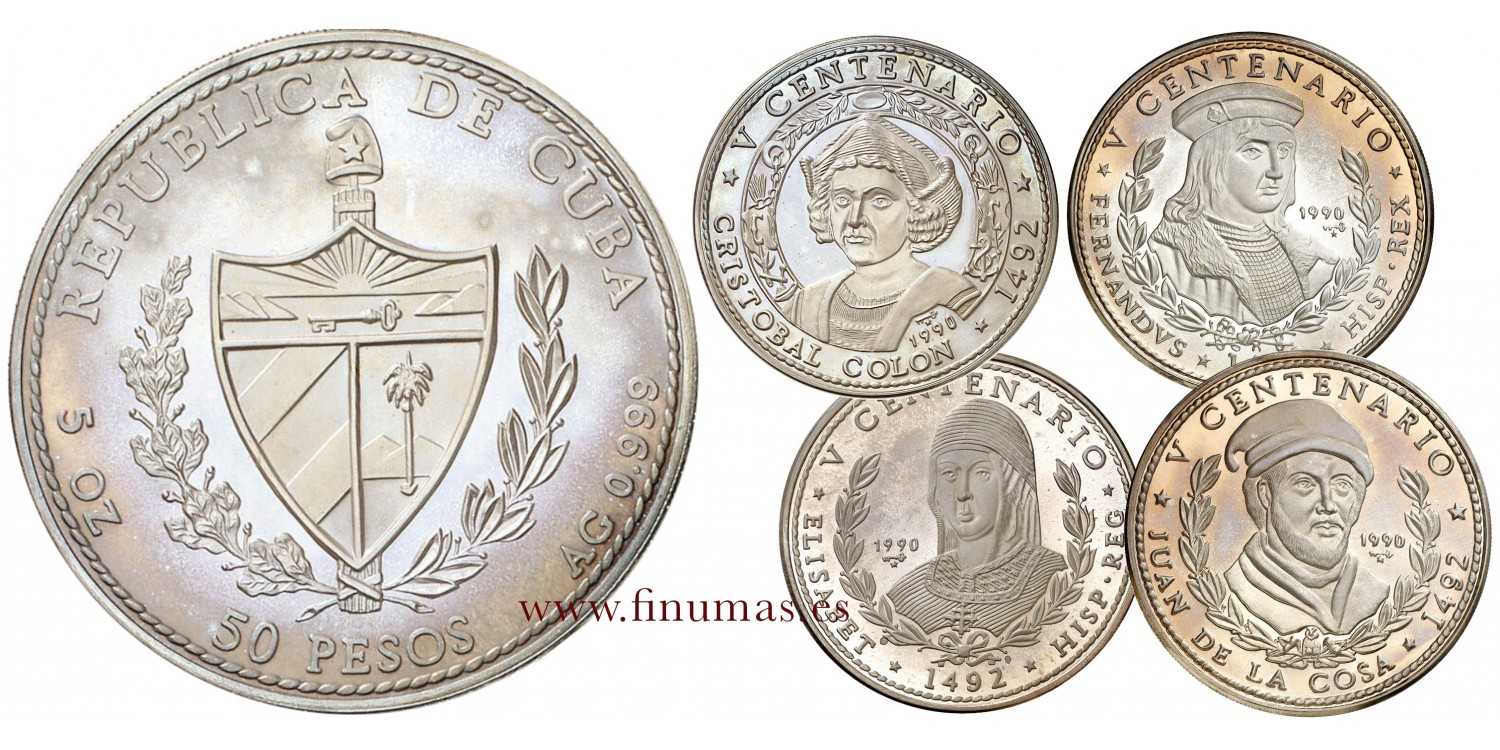 Serie conmemorativa V Centenario 1492-1992. I Serie Hispano Americana Cuba 1990. Lote de las 4 piezas de 50 pesos. (Plata (.999) – 65 mm – 155,5 g.). Presentadas en sus correspondientes hojas especificas de la marca Pardo